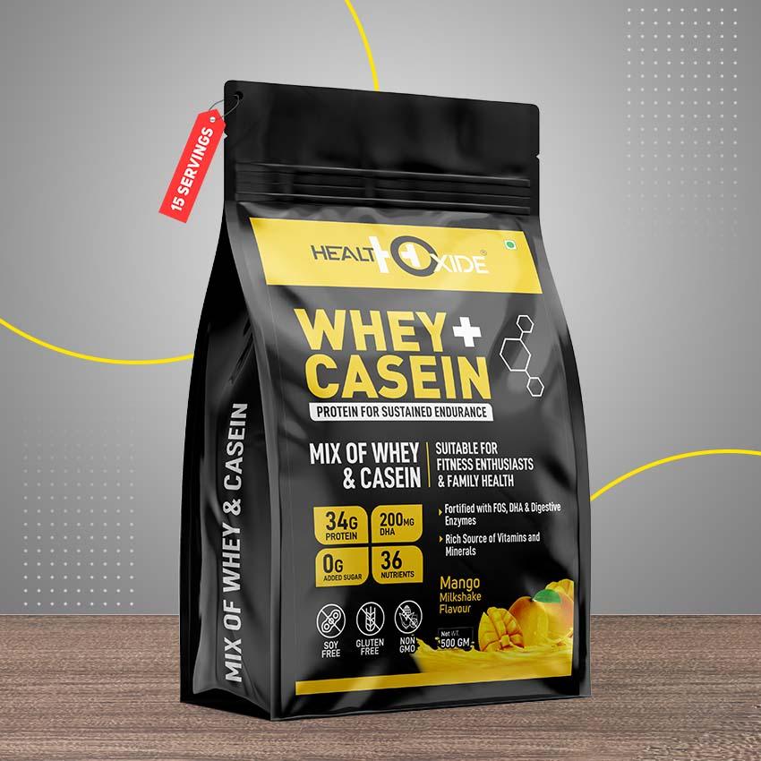 Mix 1 scoop (approx. 34g) of Whey + Casein Protein with 250–300 ml of water or milk.